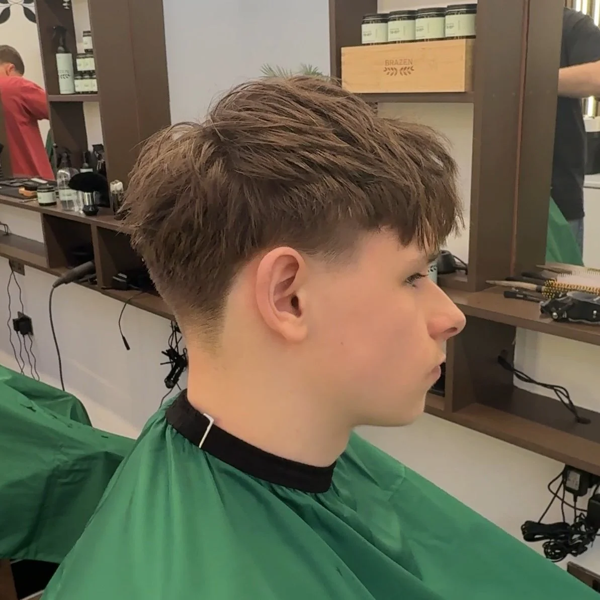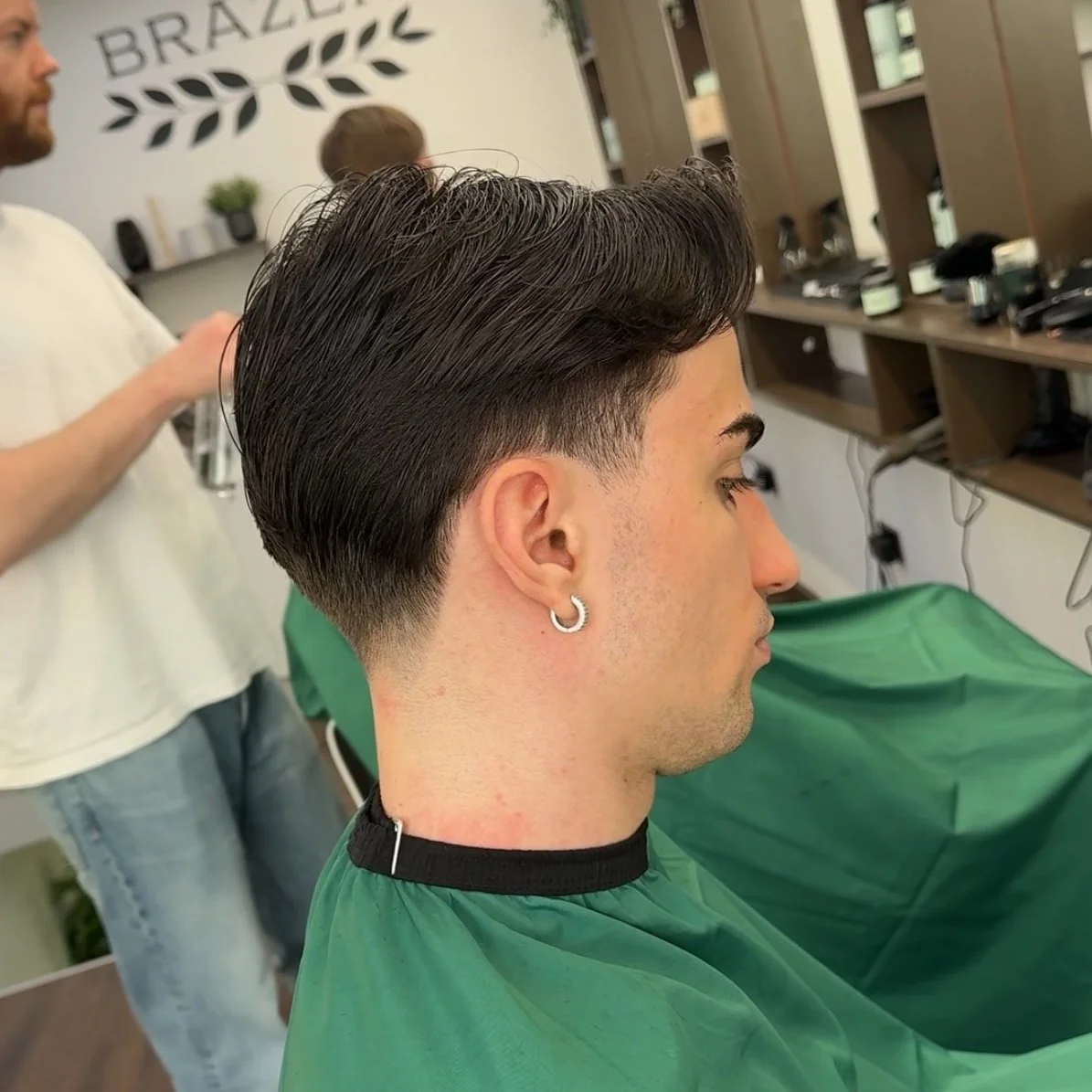 A smooth fade, blended perfectly by taking care of the loss of colour pigment in some of the hair during the blend. The man with the fade is sitting in brazen mens hair