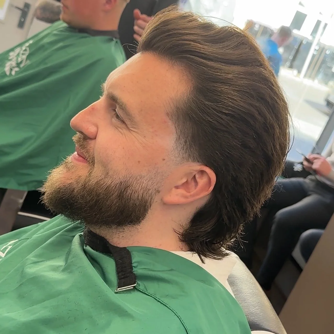 Gentleman looking out onto Leith Walk, Edinburgh sat in barbershop with long mullet style haircut. Sides are shaved to show fresh fade with longer hair on the top and back of the head