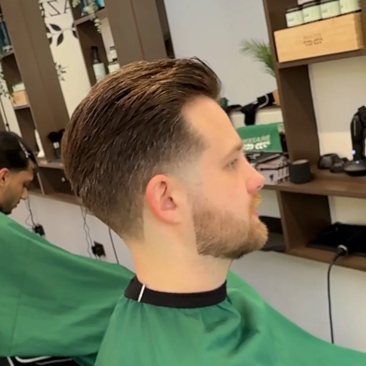 A man happy with his perfectly sculpted beard trim and haircut. This complex trim Wass carried out in brazen mens hair as seen on some of the gown.
